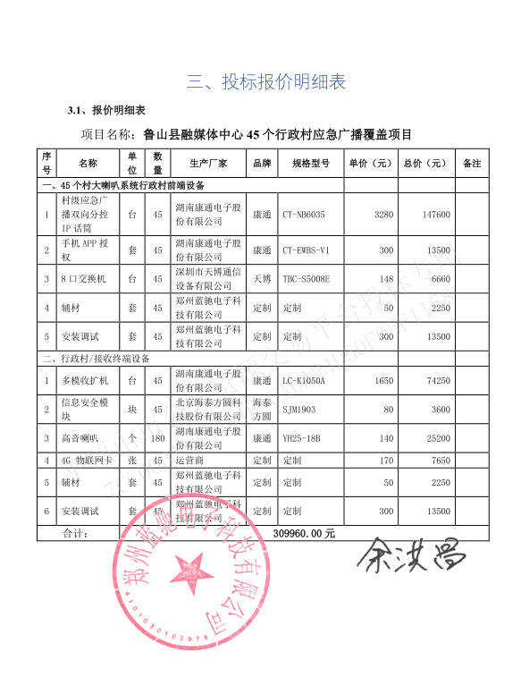 平公资采******号-1 鲁山县融媒体中心45个行政村应急广播覆盖项目 ******有限公司 郑州市中原区中原西路169号30号楼2单元21层361号 309,960.00 评审总得分:89.4分